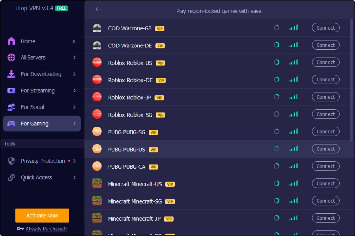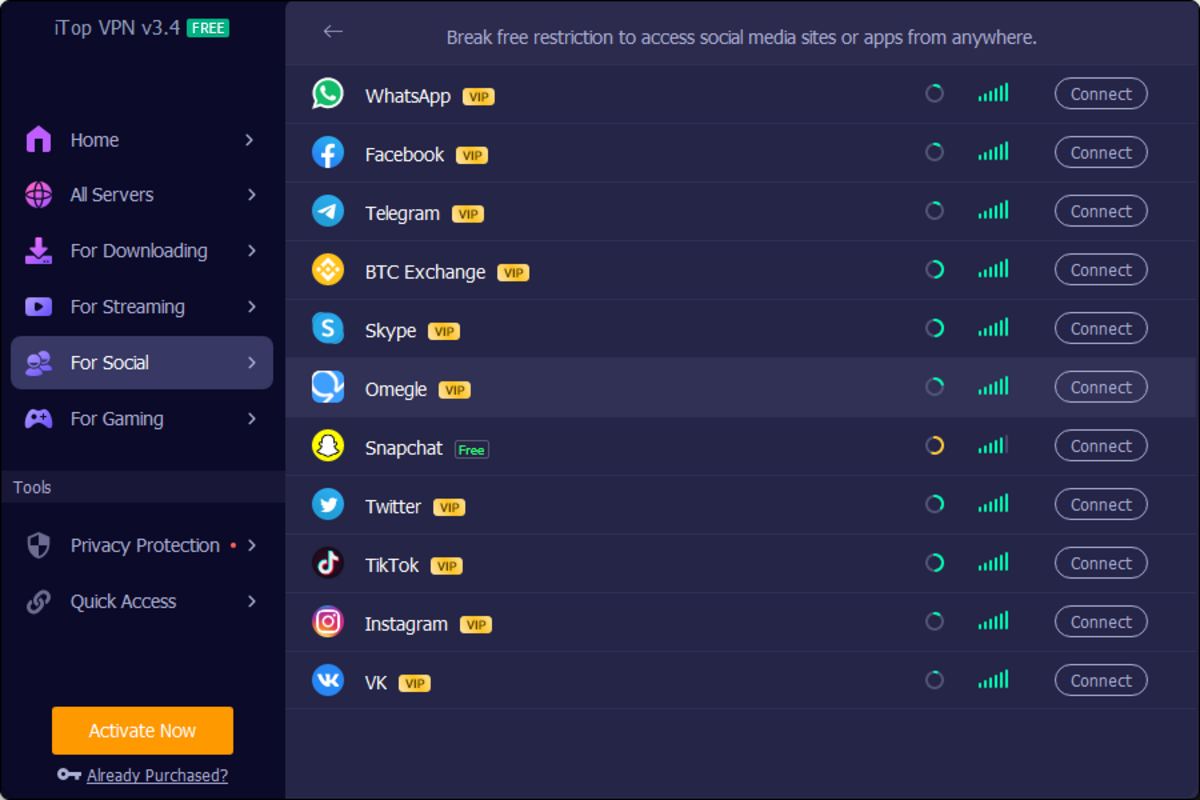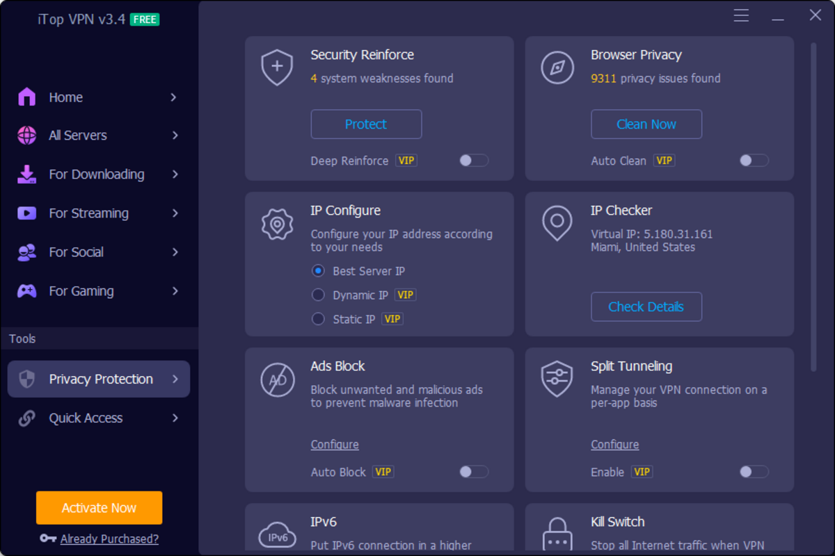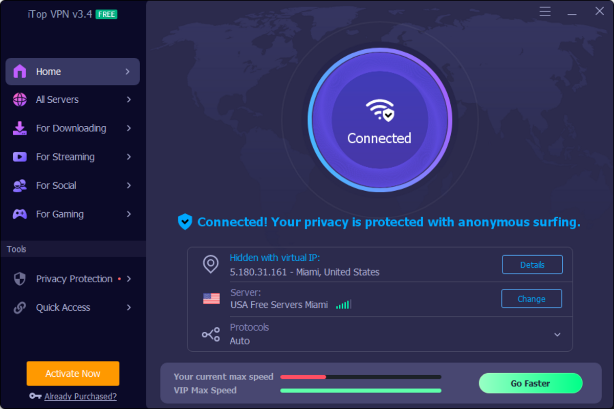 - 匿名性とプライバシー: iTop VPNはIPアドレスをマスクし、第三者によるオンライン活動の追跡を防止します:VPNは高速で安定した接続を提供し、シームレスなインターネットとストリーミング体験を保証します。